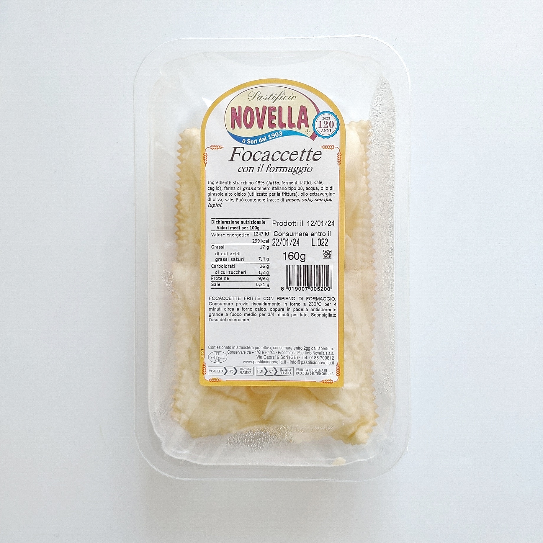 Ingredienti: Stracchino 48% (latte, fermenti lattici, sale, caglio), farina di grano tenero italiano tipo 00, acqua, olio di girasole alto oleico (utilizzato per la frittura), olio extravergine di oliva, sale.